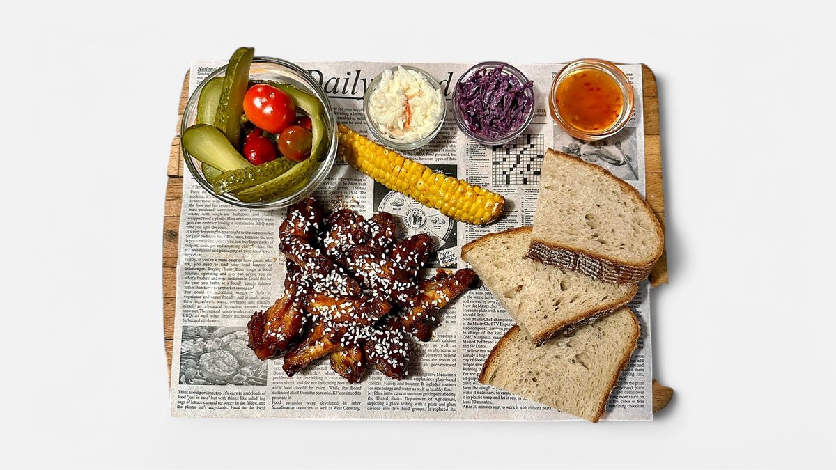 /kuracie krídelká preliate domácou bbq omáčkou, grilovaná kukurica, kyslé uhorky, feferónky, coleslaw, sweet chilli omáčka, sezamové semiačka, domáci chlieb/