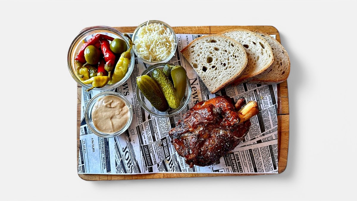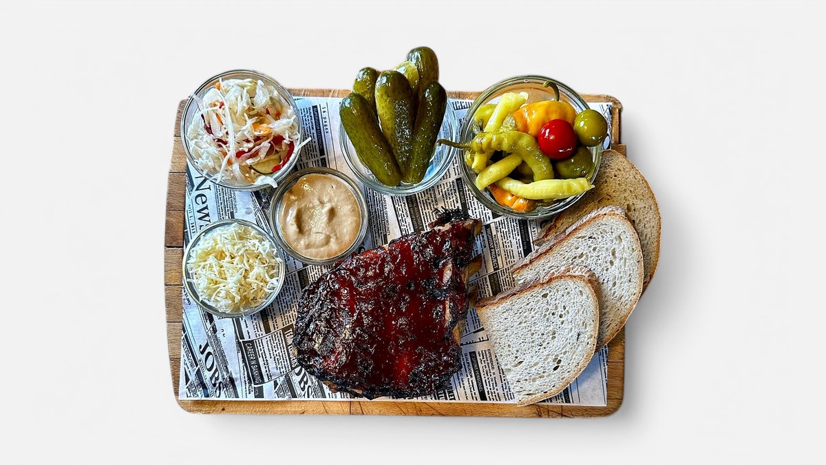 /grilované vysoké mäsové rebierka zapečené s našou domácou bbq omáčkou, kyslá uhorka, baranie rohy, feferónky, čalamáda, chren, horčica, domáci chlieb/