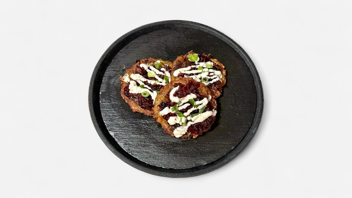 3x zemiaková placka, pomaly pečená trhaná kačka, cibuľové chutney s červenou repou, jarná cibuľka, feta syr, cesnaková aioli mayo