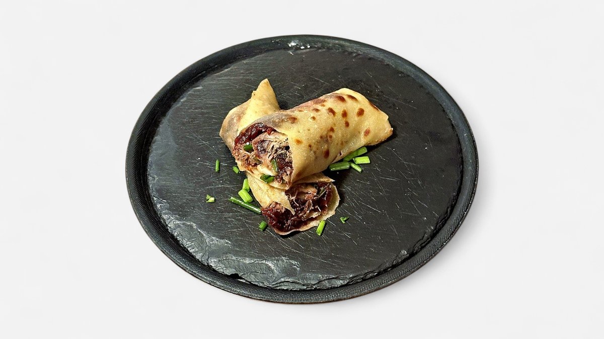 Mastená zemiaková lokša plnená pomaly pečeným trhaným kačacím mäsom, cibuľove chutney s červenou repou a pažitka