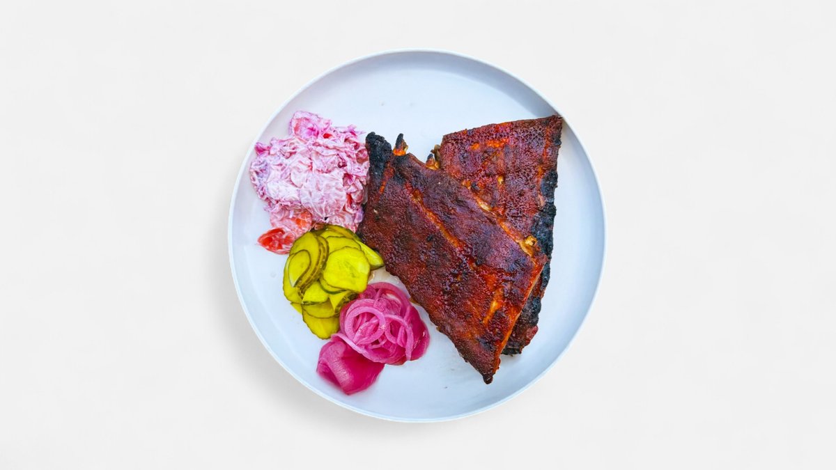 Pomaly pečené zaúdené rebierka, nakladaná zelenina, chipotle majonéza, colleslaw šalát
