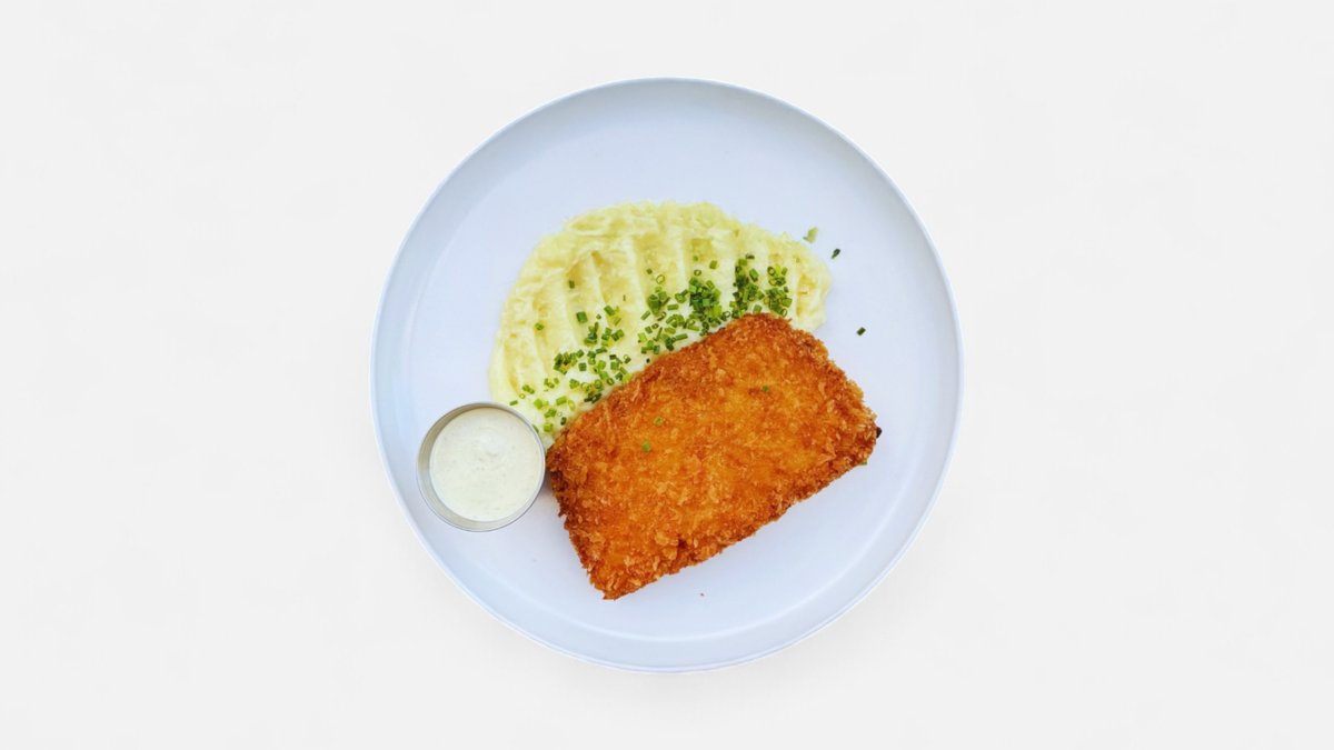 Domáci vyprážaný kravský syr, zaúdené zemiačiky, remuláda, bylinky.