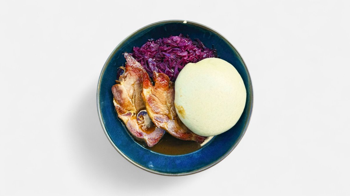 Zaúdená pečená krkovica, červená karamelizovaná kapusta, domáca knedľa