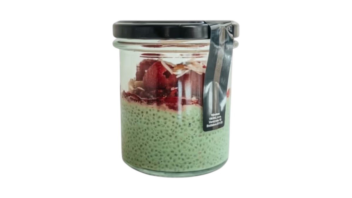Chia semiačka, kokosové mlieko, matcha Konomi, agáve, maliny, kokos, biela vegan čokoláda