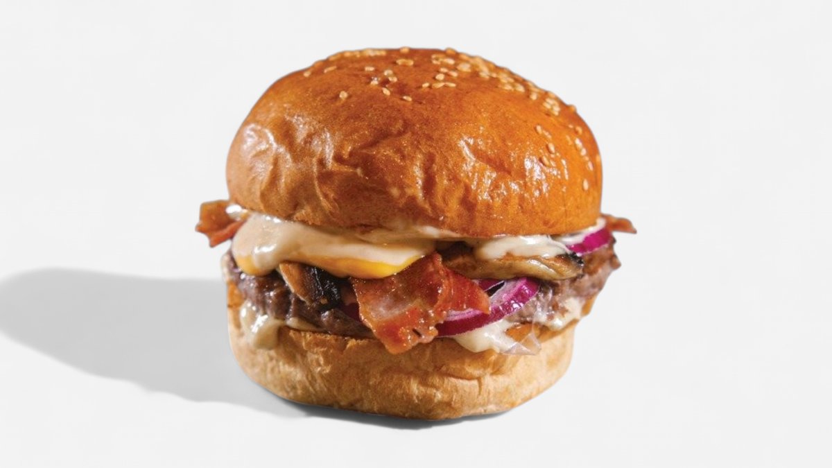 grilovaný hovädzí burger, slanina, syr, grilované šampiňóny, červená cibuľa, hľuzovková majonéza 350 g / A: 1, 3, 7, 11