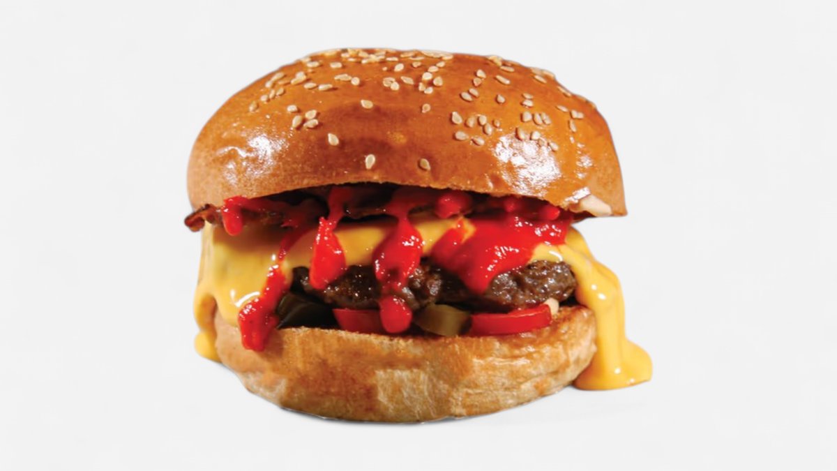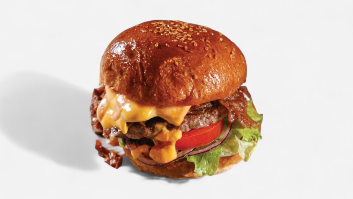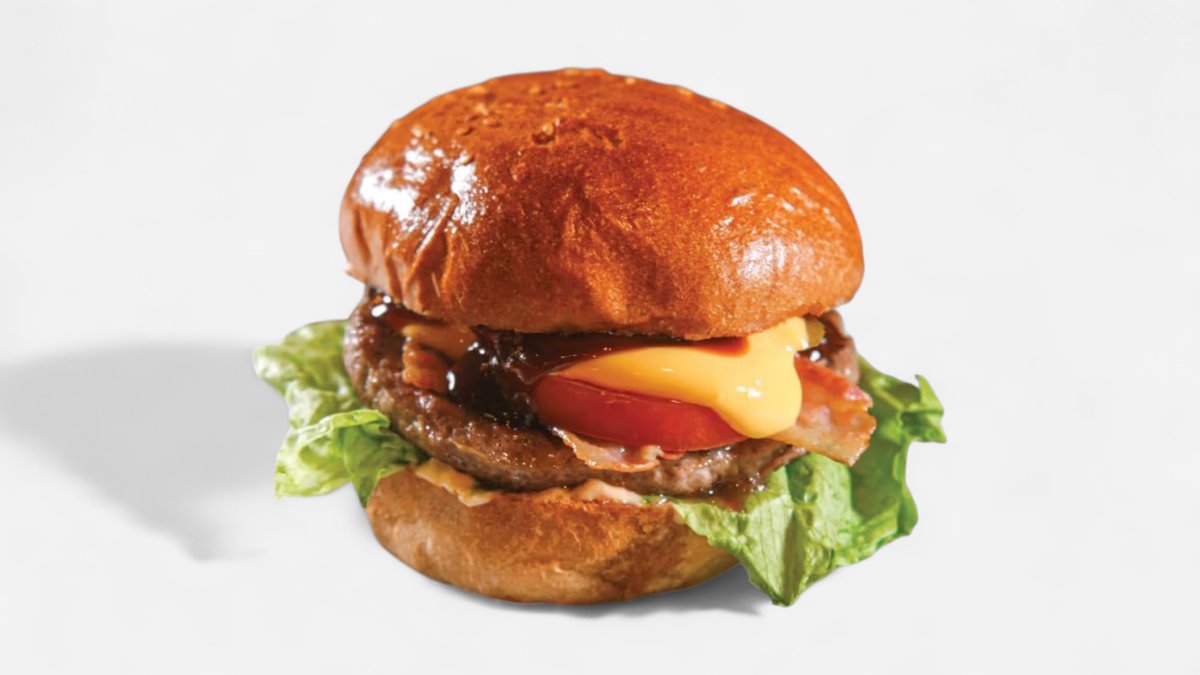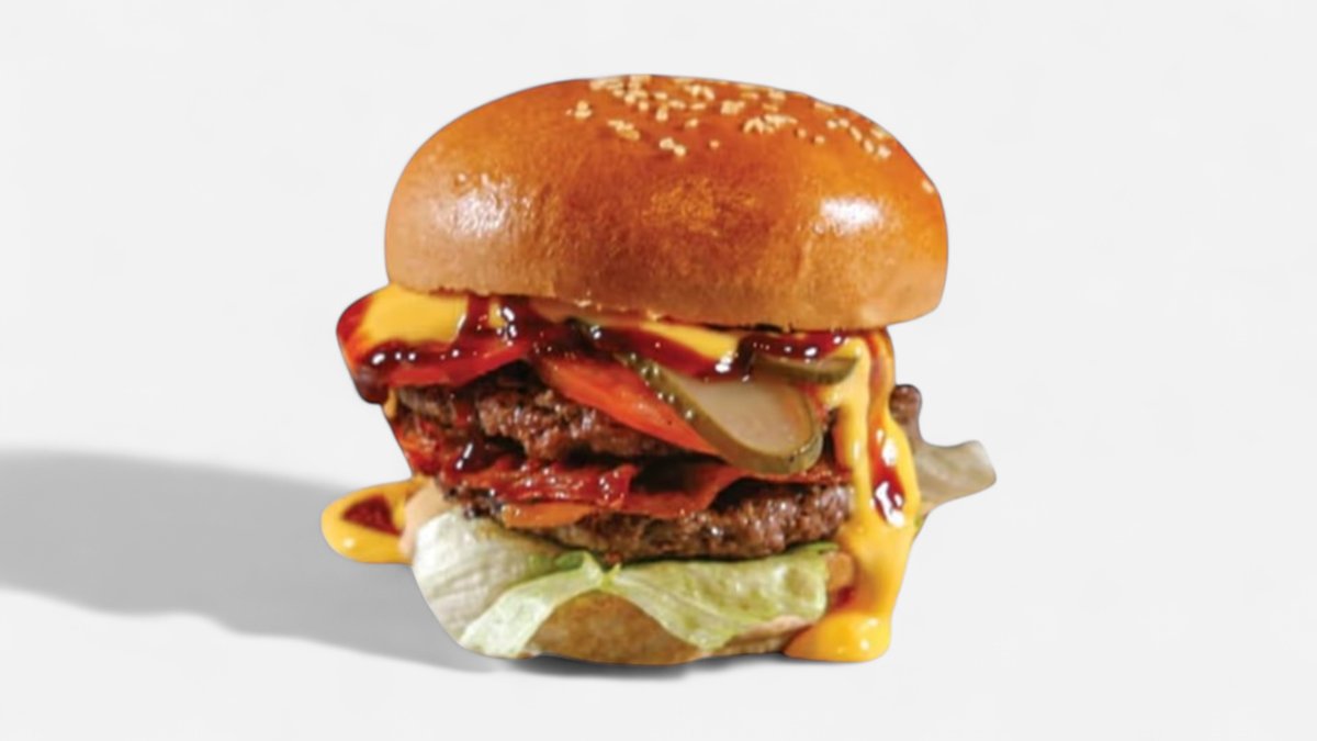 dvojitý grilovaný burger, syr šalát, paradajka, slanina, kyslá uhorka, majonéza, BBQ omáčka 490 g / A: 1, 3, 7. 11