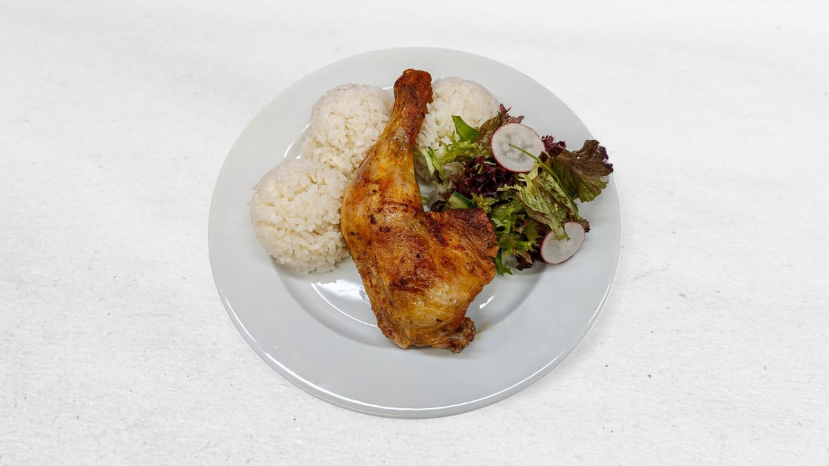 Pečené kuracie stehno s ryžou a kompótom, prílohu je možné zmeniť. 350g