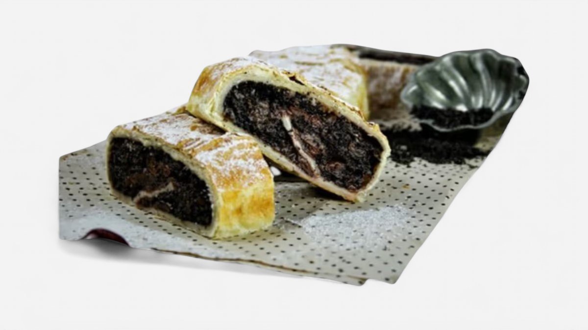 Chutná maková štrúdľa z lístkového cesta so šťavnatými višňami. A: 1,7 100g