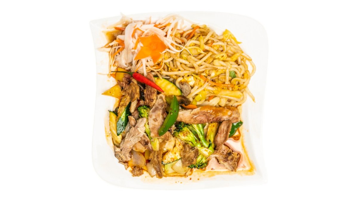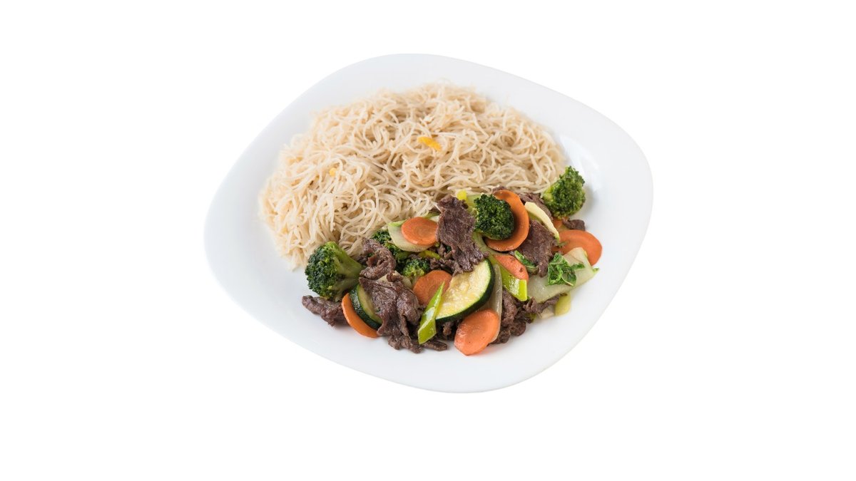 cibuľa, cuketa, bambus, brokolica, mrkva, arašidová omáčka, šampión, ryža, hovädzie mäso 300g / obsahuje: 5,6