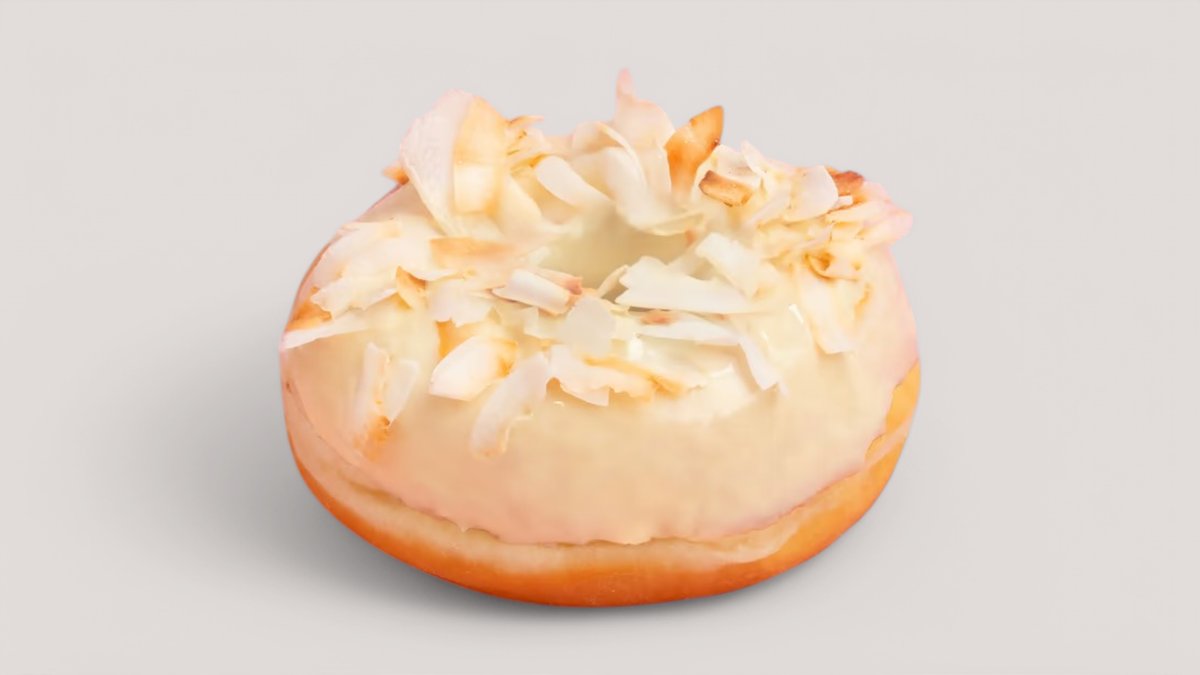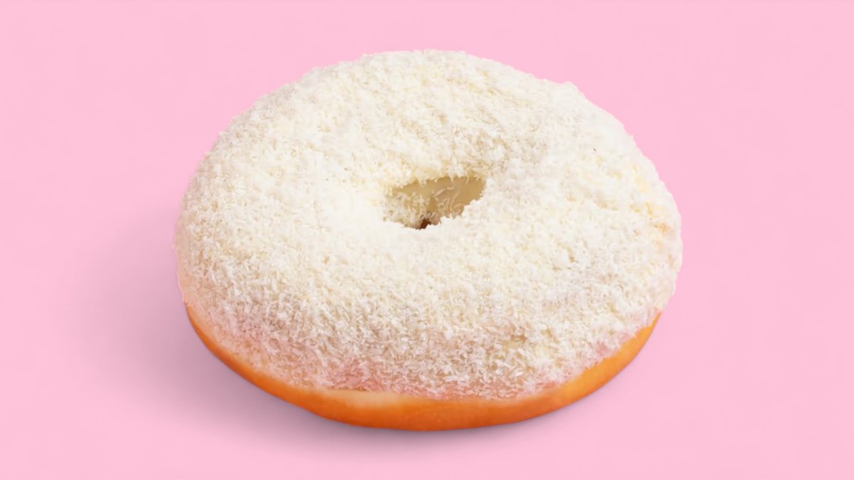Osviežujúci donut so sladkou kokosovou glazúrou, ozdobenou chutným kokosovým posypom. Obsahuje 1,5,6,8.