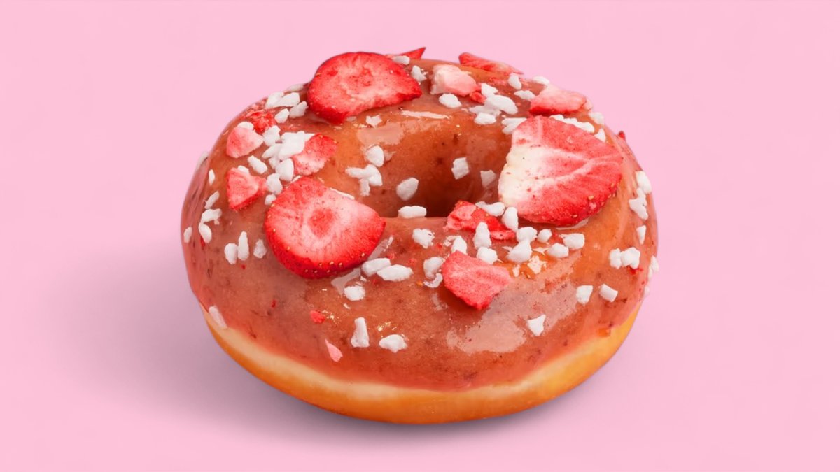 Osviežujúci donut so sladkou jahodovou glazúrou, ozdobenou chutnými mrazom sušenými jahodami. (VEGAN) Obsahuje: 1