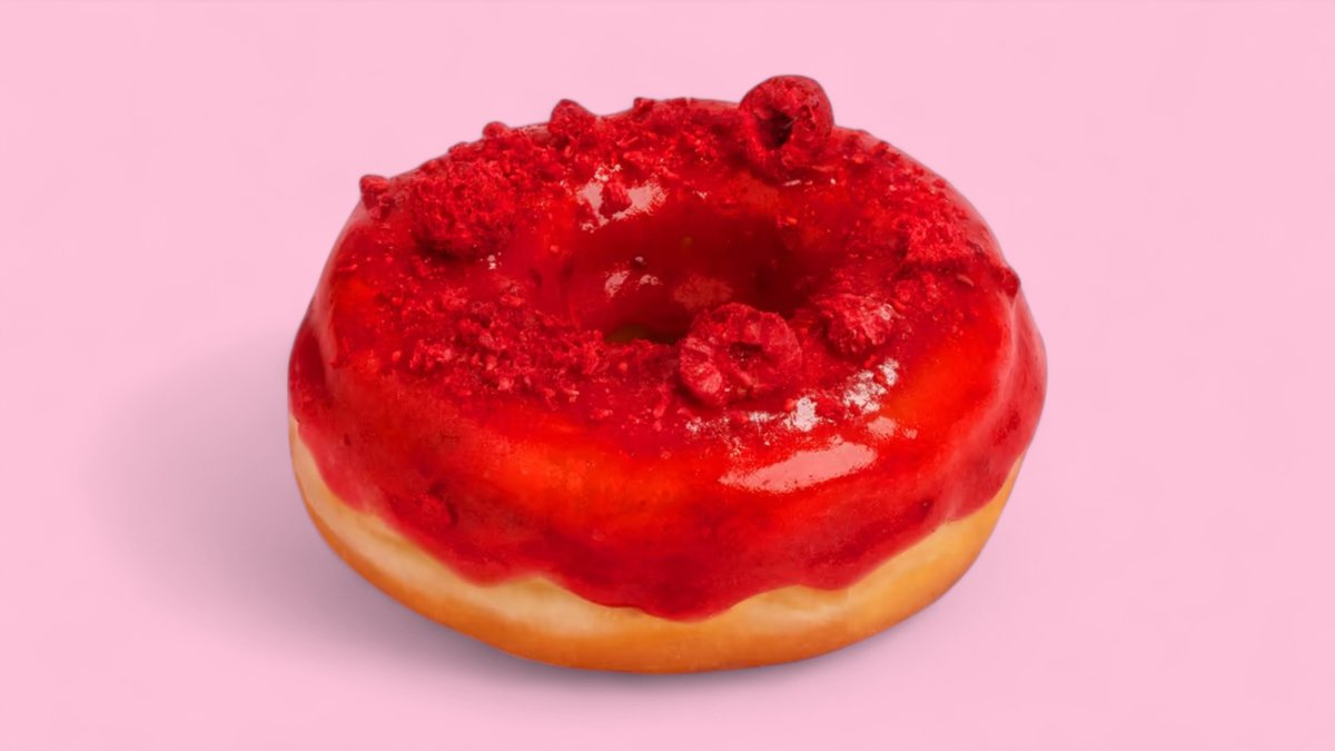 Osviežujúci donut so sladkou malinovou glazúrou, ozdobenou chutnými mrazom sušenými malinami. Dostupný taktiež v Low Sugar verzii. (VEGAN) Obsahuje: 1