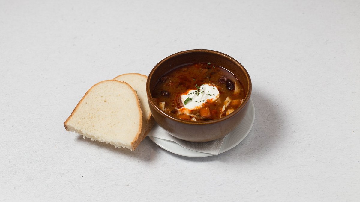 Fazuľová polievka s údeným rebrom, cestovinou a kyslou smotanou (1, 3, 7, 12 | 0,33 l)