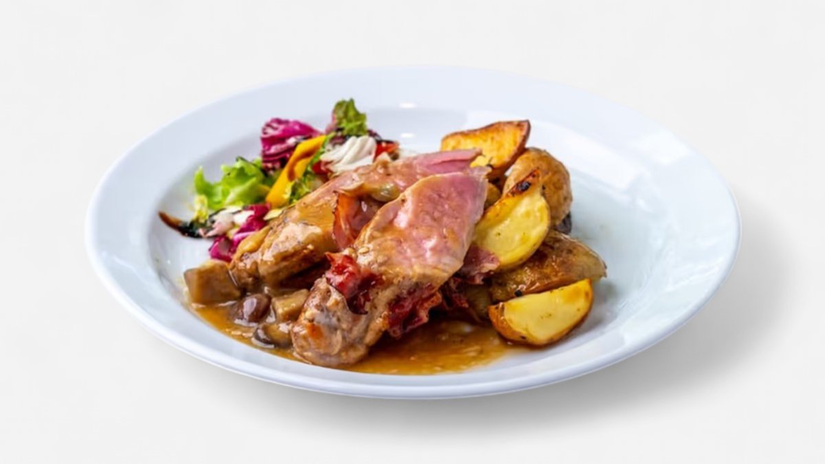 Grilovaná panenka v slanine, omáčka zo sušených hríbov, pečené mladé zemiaky (1, 3, 7 | 160 g)
