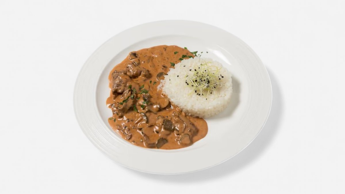 Teľací Stroganoff, dusená ryža s cukrovým hráškom (7, 9, 10 | 160 g)