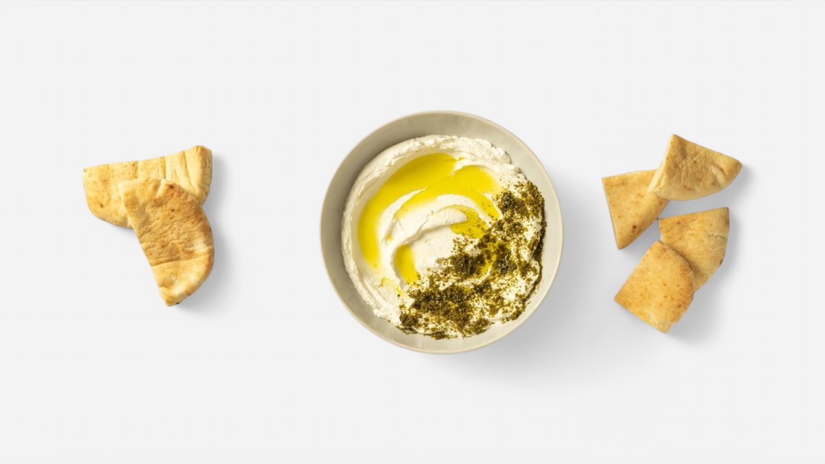 cícer, tahini, citrón, olivový olej, podávané s arabským chlebom 200g / obsahuje: 1,11