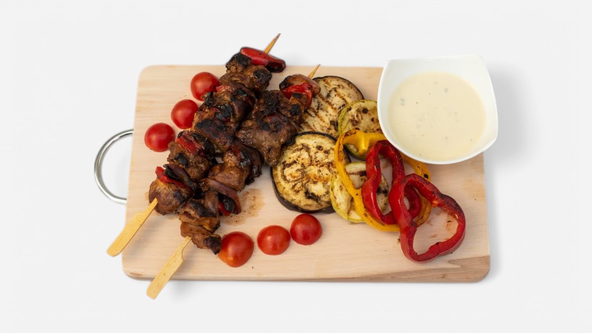 mix grilu pre dvoch obsahuje jahňacie špízy, shish taouk a kafta, podávané s paradajkami, cesnakovým dipom a arabským chlebom 600g / obsahuje: 1,7,11