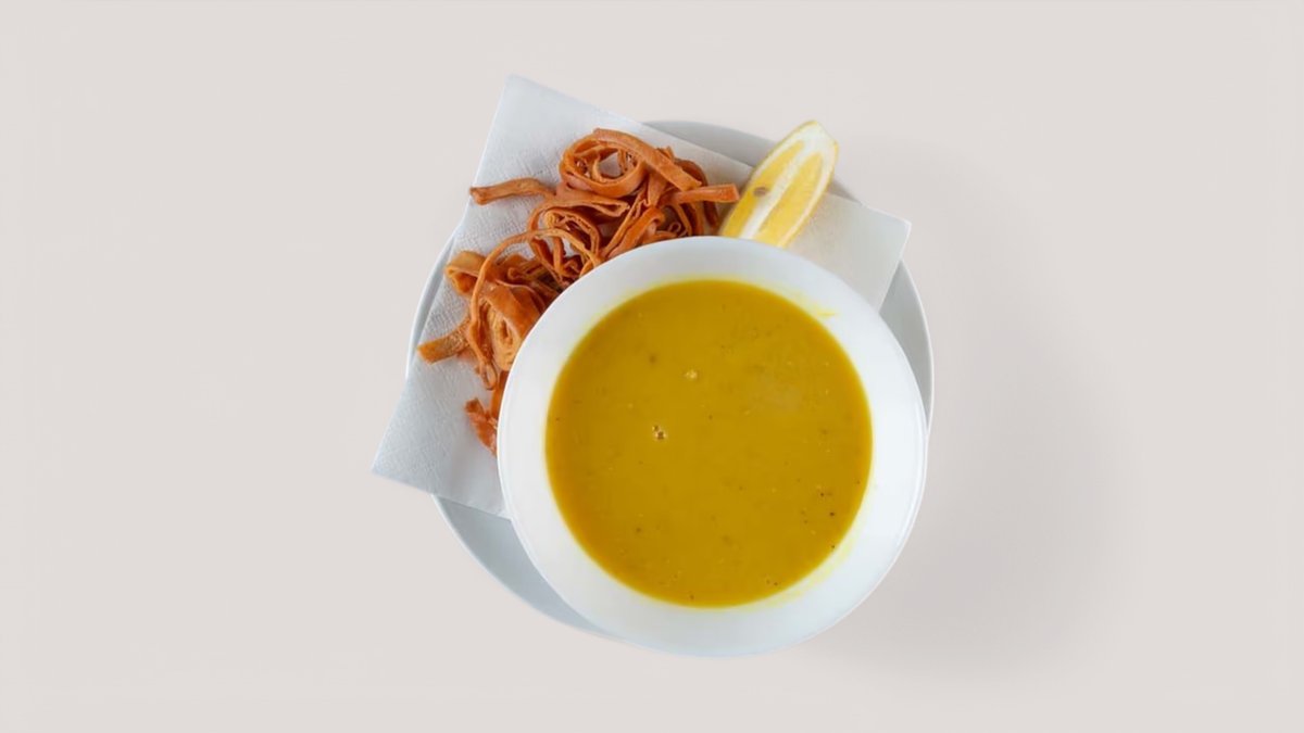 krémová polievka z červenej šošovice so zemiakmi, mrkvou, cibuľou, bylinkami, citrónom a koreninami, podávaná s chlebom 0,3l / obsahuje: 1,7,9