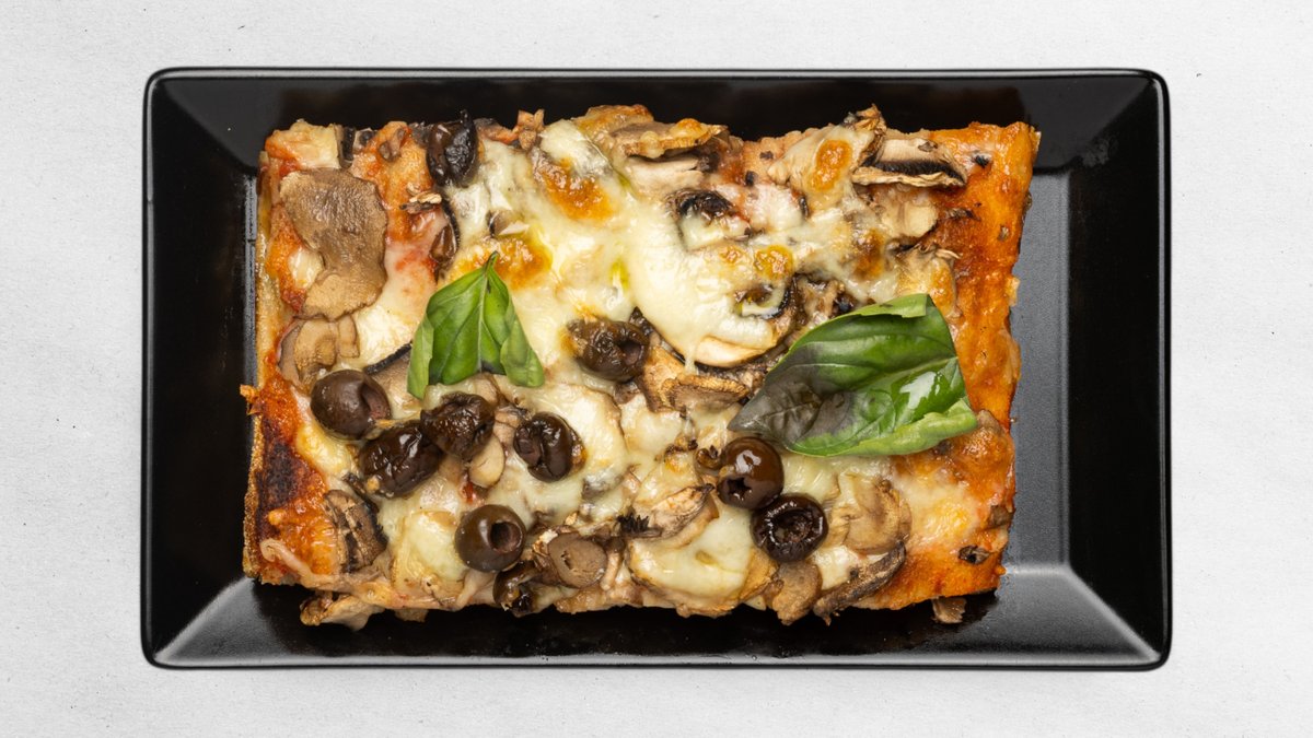 Paradajkový základ, mozzarella fior di latte, šampiňóny, čierne olivy / obsahuje:1,7