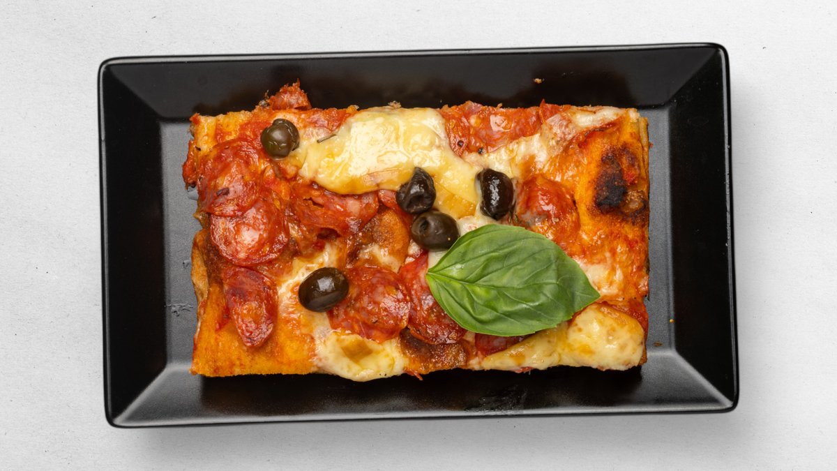 Paradajkový základ, mozzarella burrata, olivy - taggiasche, cherry paradajky, bazalka / plech má rozmer 60x20cm - obsahuje 5 ks pizze s rozmerom 10x20cm / obsahuje alergény: 1,7