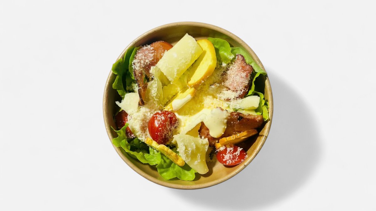 ľadový šalát, paradajky, uhorky, parmezán, chrumkavé krutóny, kurací rezeň, César omáčka, taliansky syr / obsahuje: 1,3,7,10