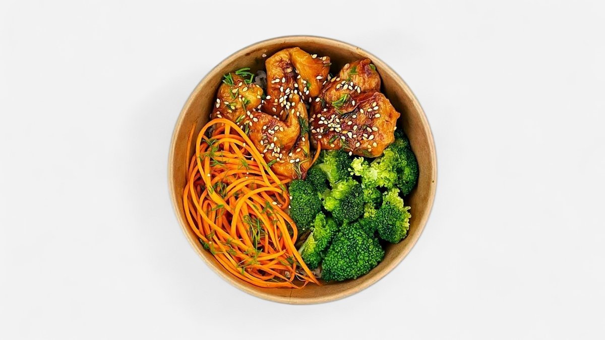Kúsky kuracieho mäsa v aromatickej teriyaki omáčke, posypané sezamovými semienkami. Podávané na ryžovom základe s čerstvou chuťou brokolice a mrkvy. 350