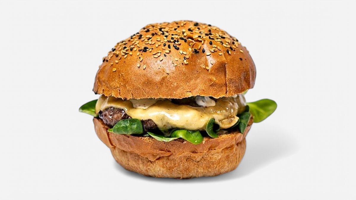 domáca žemľa, 150 g hovädzie mäso, ľadový šalát, cheddar, slanina, paradajka, kyslá uhorka, červena cibuľa, majonéza, BBQ, hranolky 150 g / obsahuje alergény: 1, 3, 6, 7, 10, 11