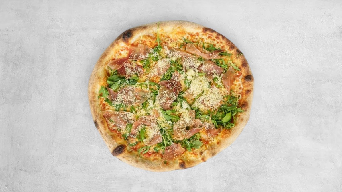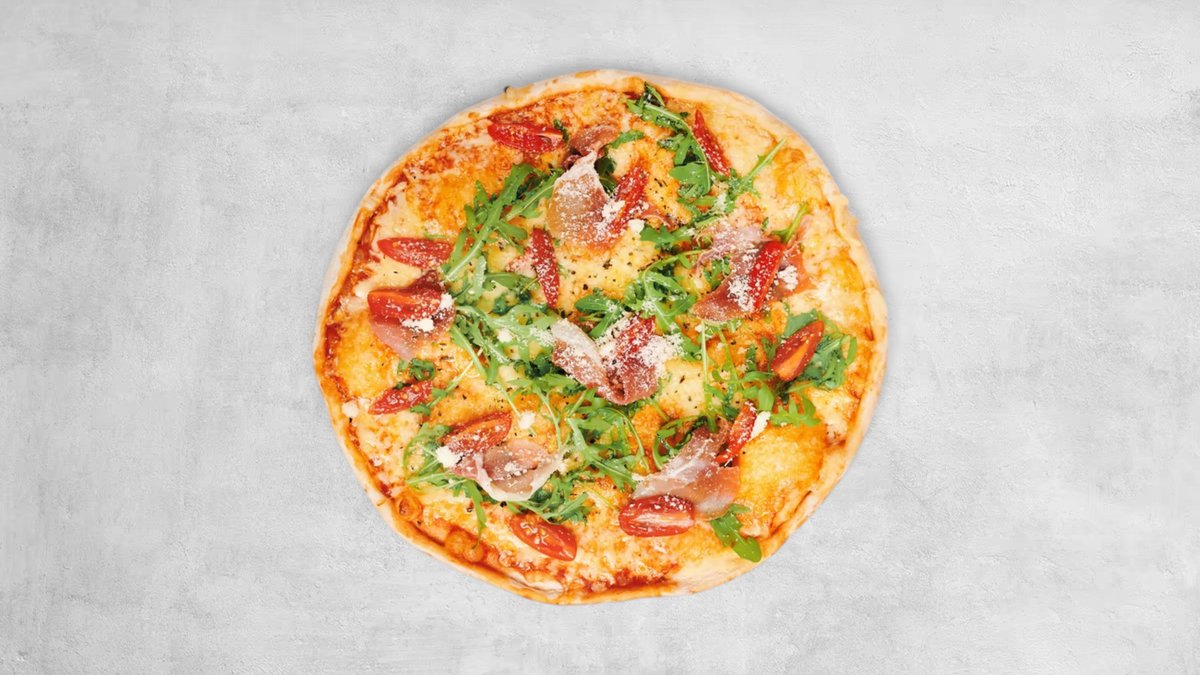 Pomodoro, syr Mozzarella, šunka, cherry paradajky, bazalka, listy rukoly 500g / obsahuje: 1,3,7