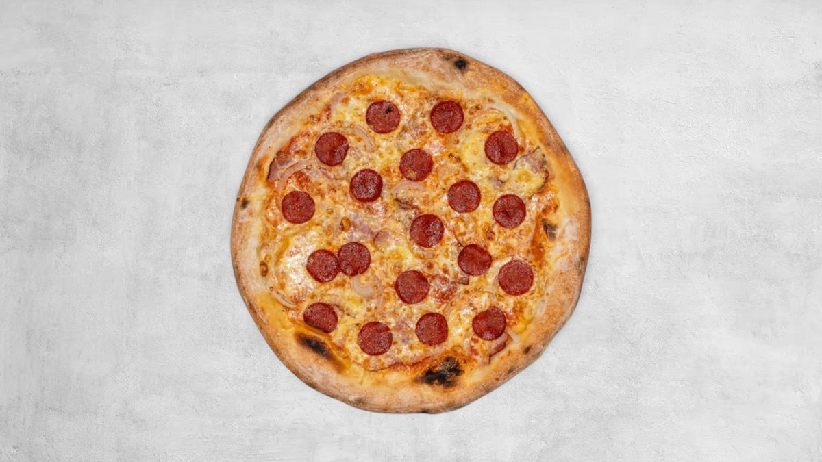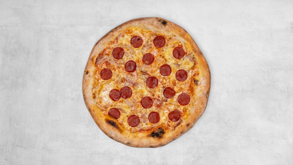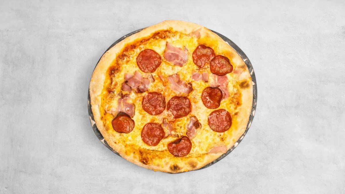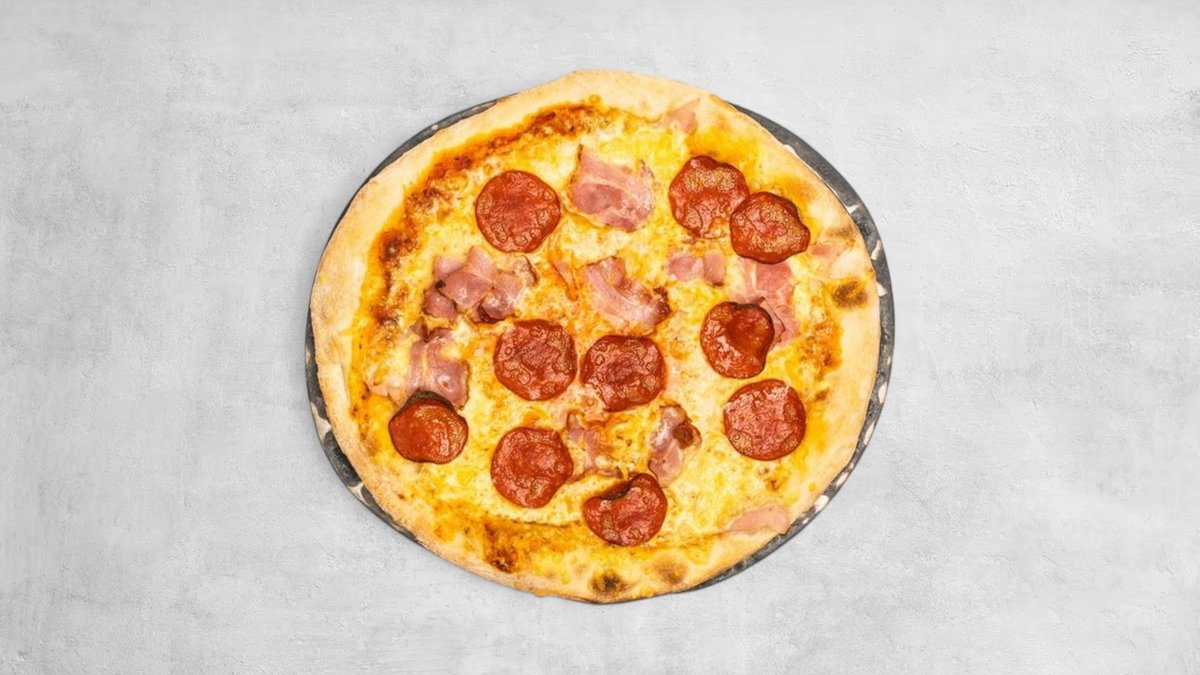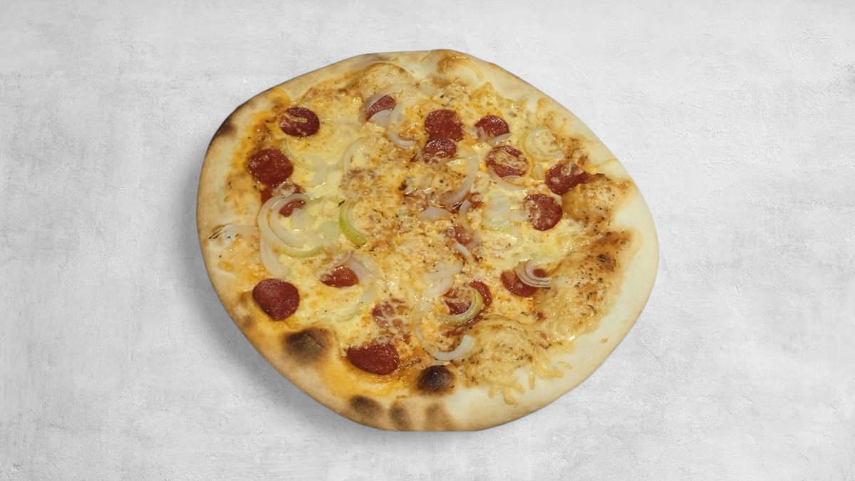 Pomodoro, slanina, klobása, cibuľa, feferóny, baranie rohy a syr 650g / obsahuje: 1,3,7