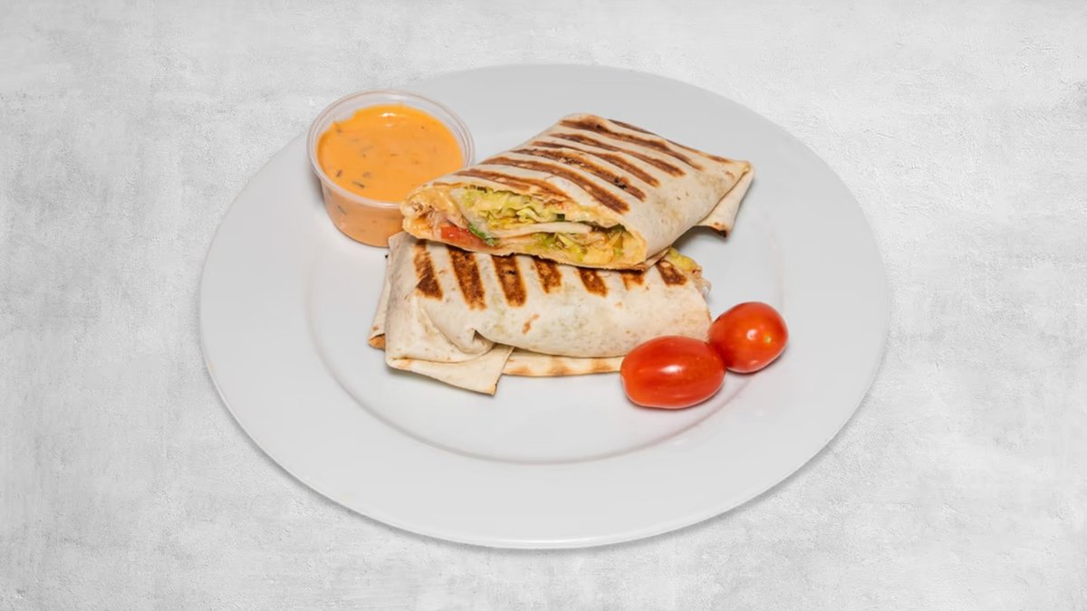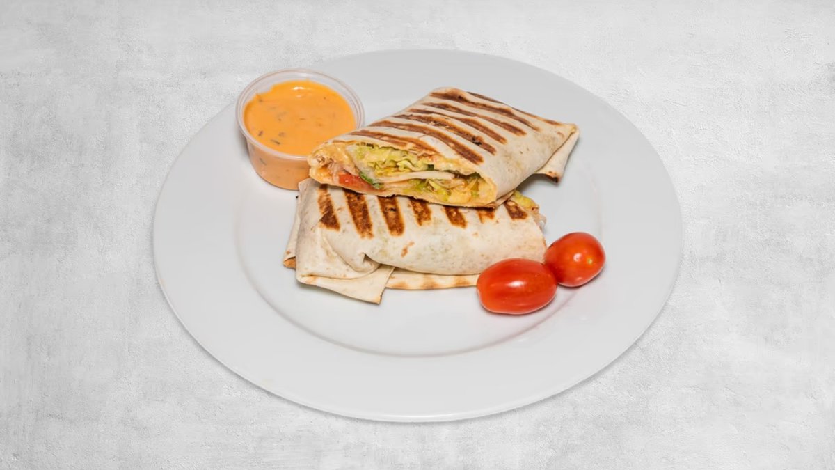 Pšeničná tortilla, syr, kuracie mäso, ľadový šalát, cibuľa, olivy, pikantný dressing