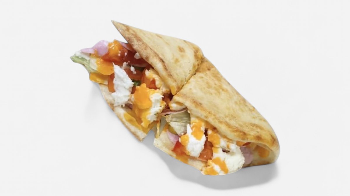 Pšeničná tortilla, syr, saláma, cibuľa, kukurica, feferónky, dressing