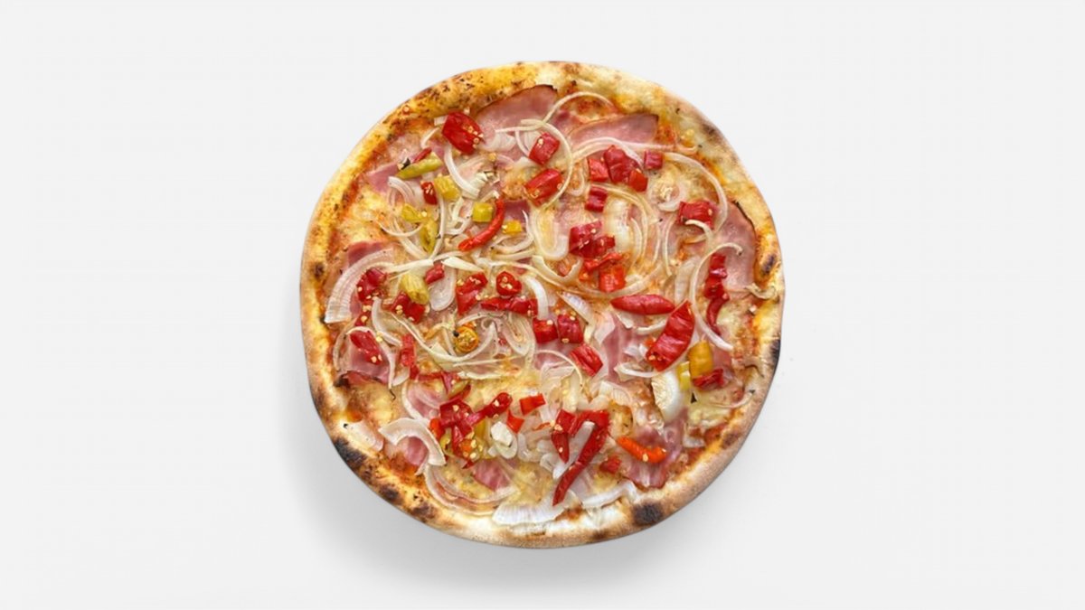 paradajkový základ, gouda, šunka, slanina, feferóny, cibuľa (všetko na jemno nakrájané),oregáno 550 g / obsahuje: 1,12,15,7,3