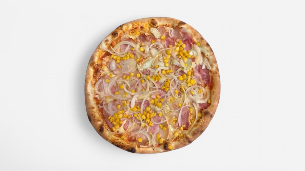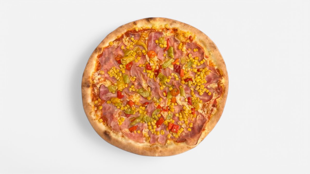 paradajkový základ, gouda, šunka, slanina, kukurica, baranie rohy,oregáno 500 g / obsahuje: 1,12,15,7,3