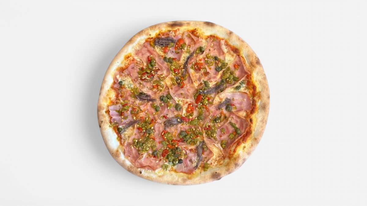 paradajkový základ, gouda, šunka, slanina, kapary, sardely, feferóny,oregáno 550 g / obsahuje: 1,12,15,7,3,4