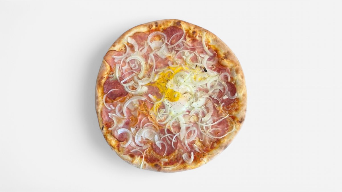 paradajkový základ, gouda, šunka, salám, slanina, cibuľa, vajce,oregáno 500 g / obsahuje: 1,12,15,7,3