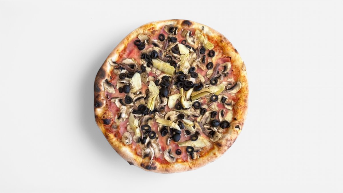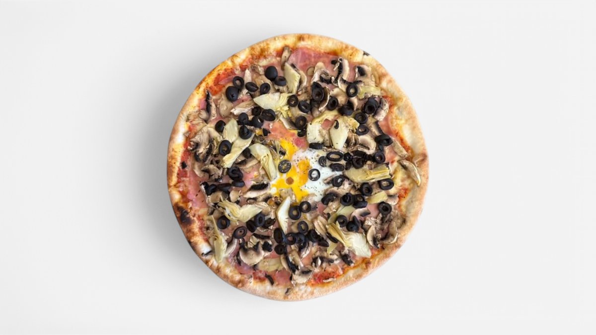 paradajkový základ, gouda, šunka, šampiňóny, artičoky, olivy, vajce,oregáno 600 g / obsahuje: 1,12,15,7,3