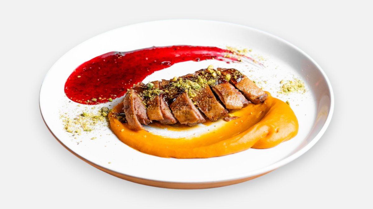 Kačacie prsia 220g. pripravované metódou sous-vide pre maximálnu šťavnatosť, následne opečené na grile do dokonale chrumkavej kože, pričom vnútri zostávajú jemne ružové. Podávame ich na hodvábnom pyré zo sladkých zemiakov, ktorého prirodzená sladkosť vytvára harmonický kontrast k plnej chuti mäsa. Brusnicová omáčka s redukciou červeného vína a orestovanou šalotkou prináša príjemnú kyslastú iskru. Finálny dotyk tvorí lyžica intenzívneho demi-glace a jemne nasekané pistácie, ktoré dodávajú textúrnu eleganciu a moderný akcent.