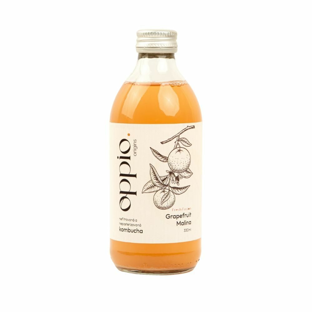 Oppio. Kombucha Fresh Fusion je nealkoholický fermentovaný nápoj novej generácie. Vyrába sa fermentáciou zeleného čaju a dochucuje sa iba skutočným grepom a malinami.