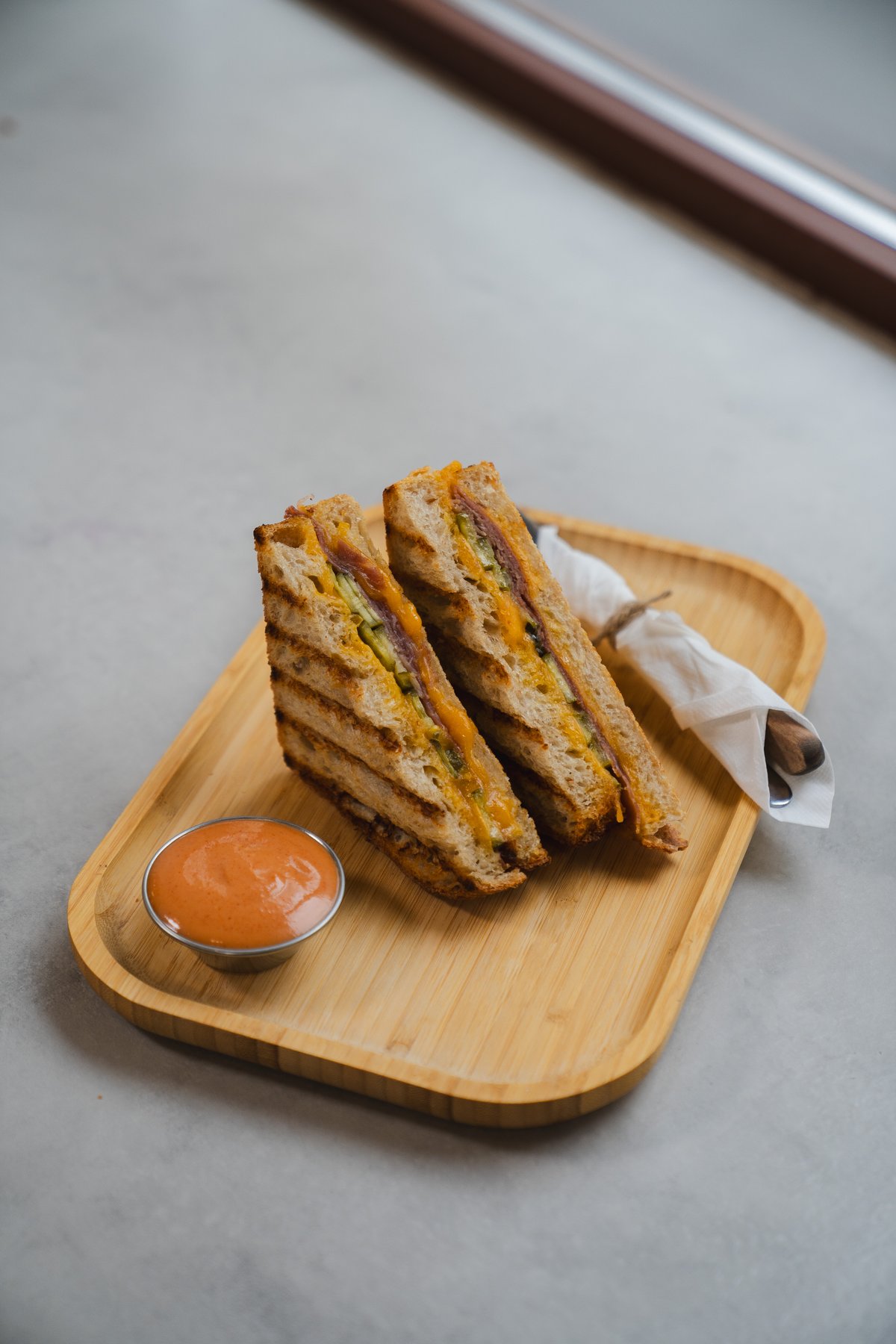 Kváskový toastový chlieb KRUH, cheddar, prosciutto, mozzarella, cibuľové chutney + Smokey mayo. 350g / Alergény 1,3,7,12