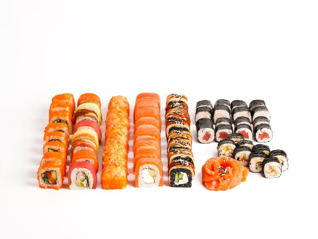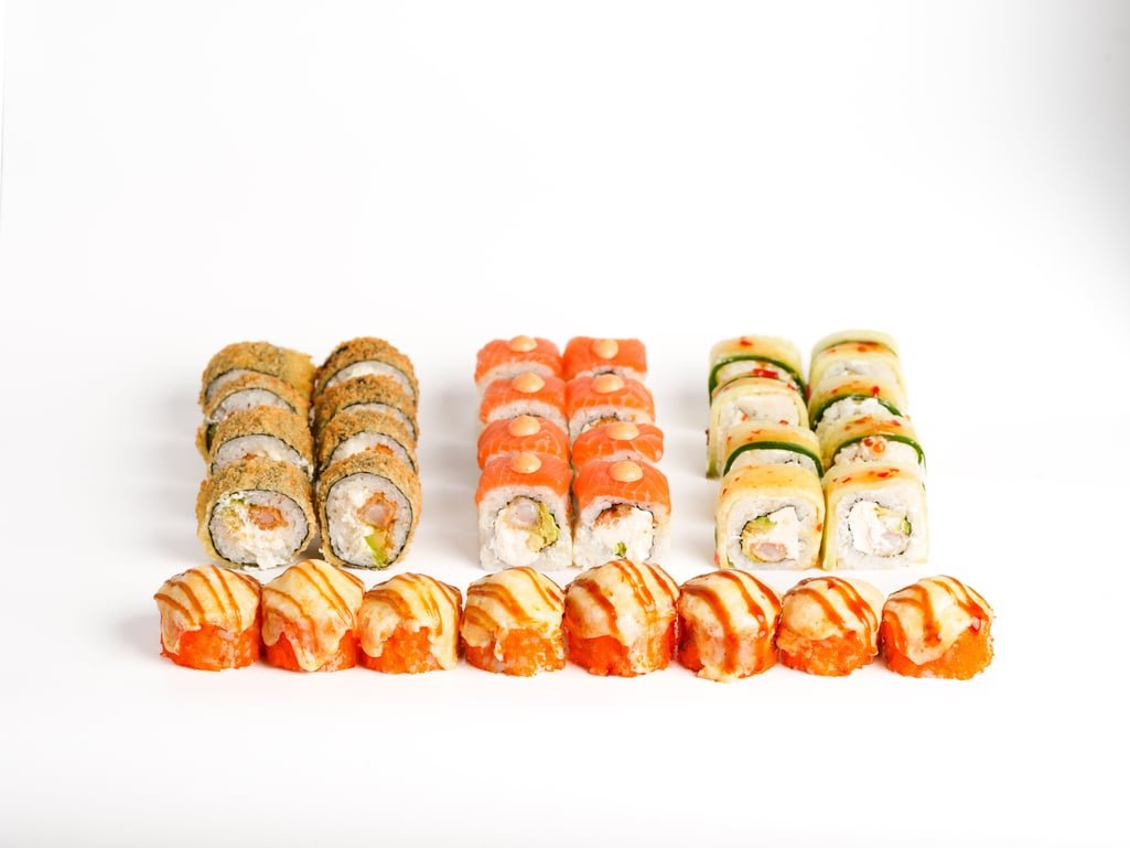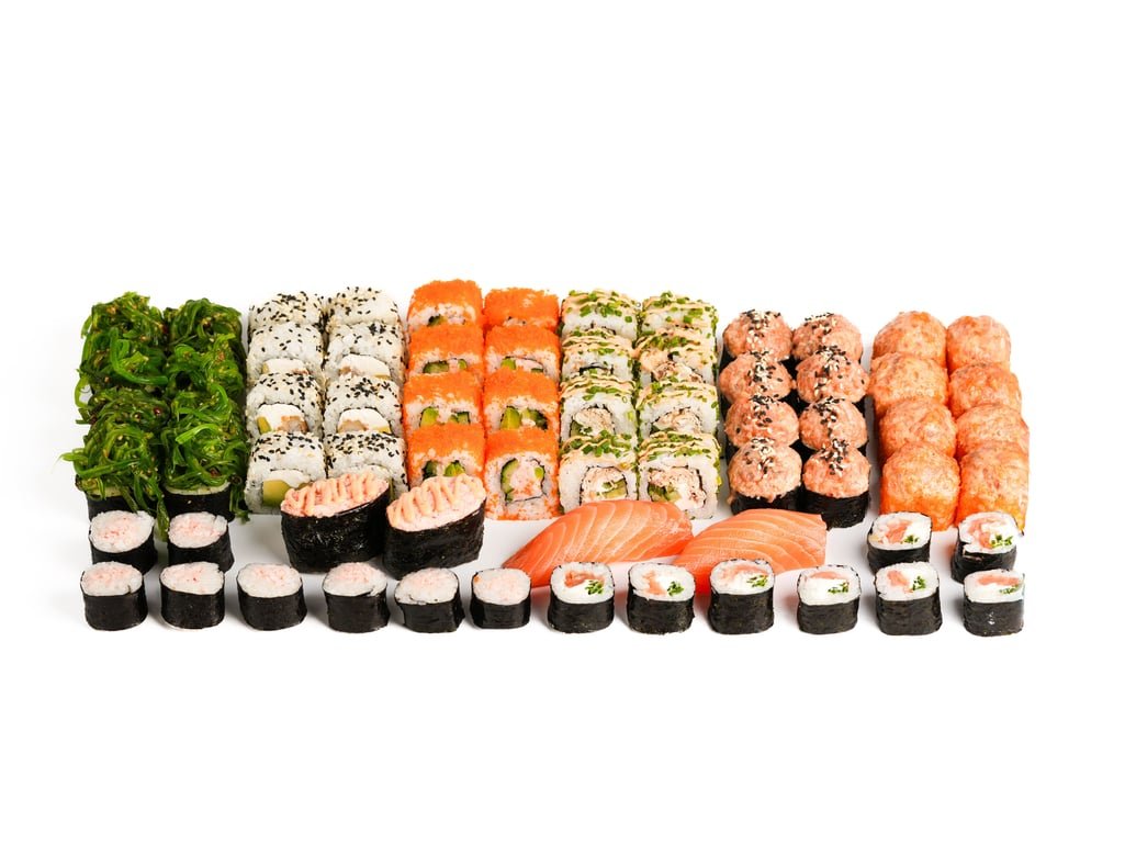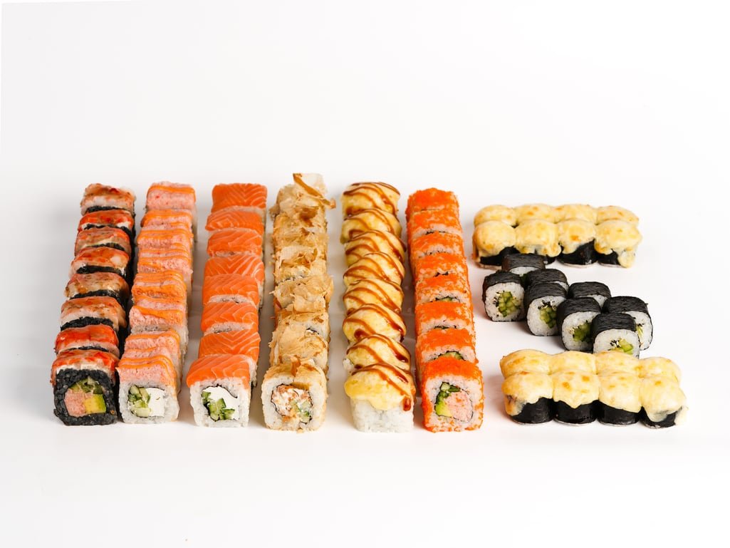 Losos, úhor, tuniak, avokádo, mix z krabov, uhorka, omáčka "Unagi". Váha: 305g Alergény: 1, 2, 3, 4, 6, 10, 12