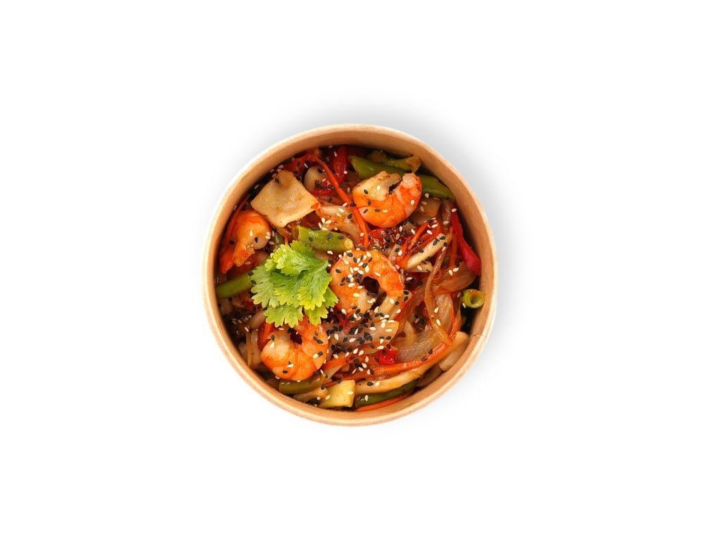Krevety, fazuľa edamame, morské riasy chuka, avokádo, orechová omáčka a sladká chilli omáčka, ryža. Váha: 385g Alergény: 1, 2, 3, 6, 10, 11