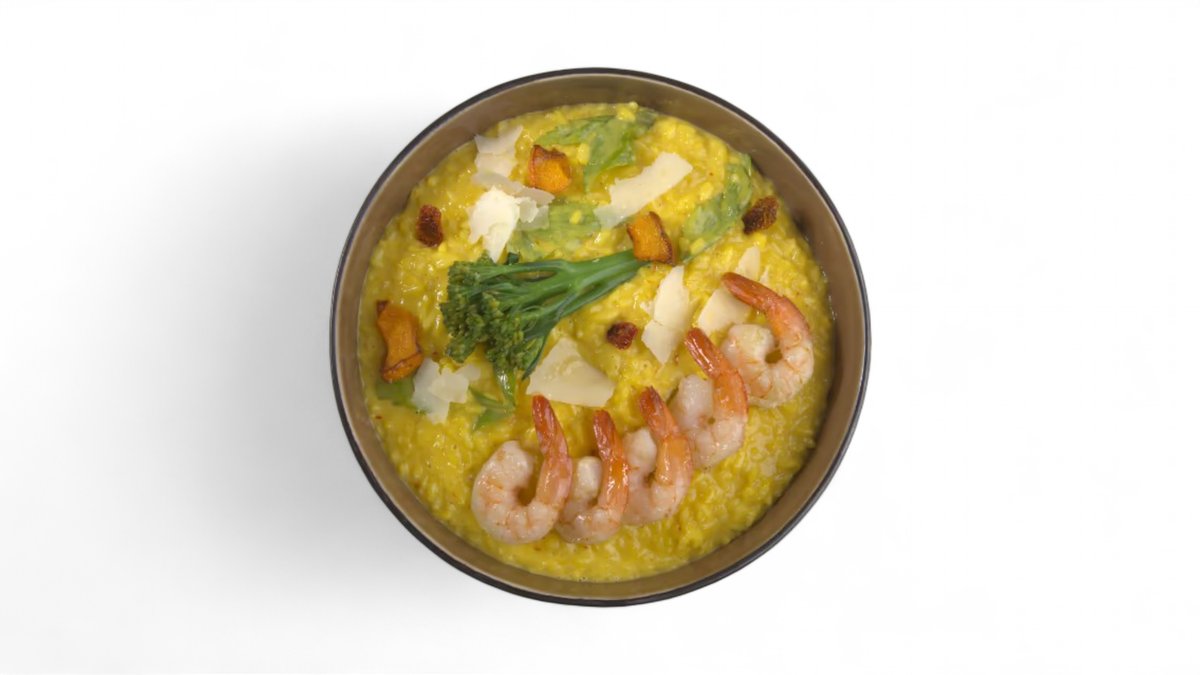 Grilované krevety, arborio ryža, blizny šafranu, divoká brokolica, tekvica, ligurček, sušené cherry, parmezán. 80g/300g / obsahuje: 2,7