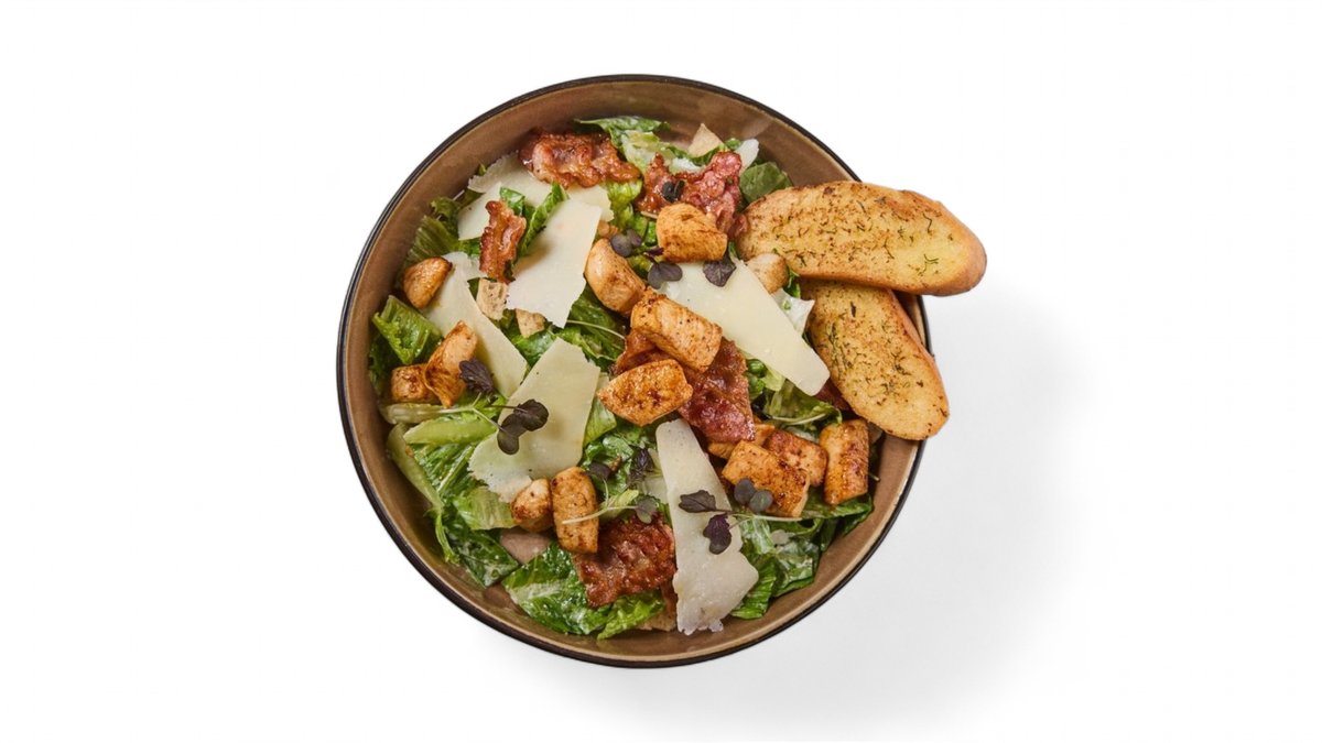 Grilované kuracie mäso, rímsky šalát, slaninka, ančovičkový dressing s krutónmi a parmezánovými hoblinami, bylinková bagetka. 80g/350g / obsahuje: 1,3,4,6,7,10,12
