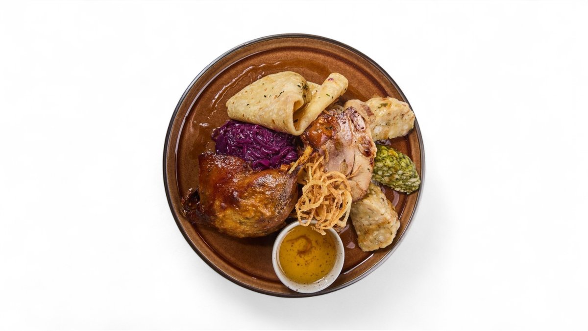 Pomaly pečené kačacie stehno, červená kapusta na víne, domáca lokša, žemľová a špenátová knedľa. 300g/500g / obsahuje: 1,3,7