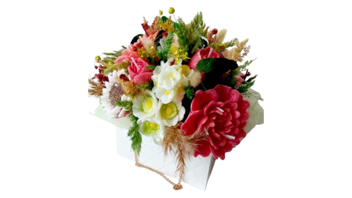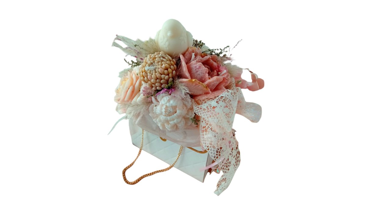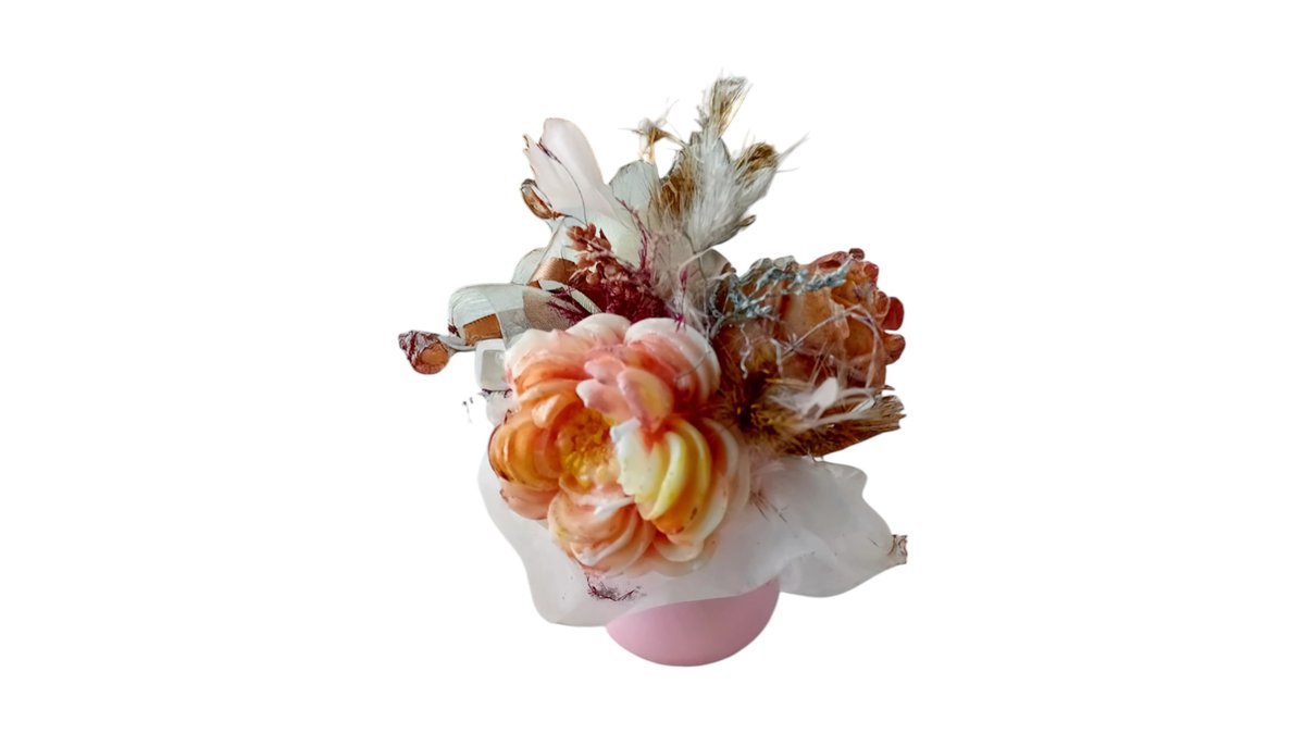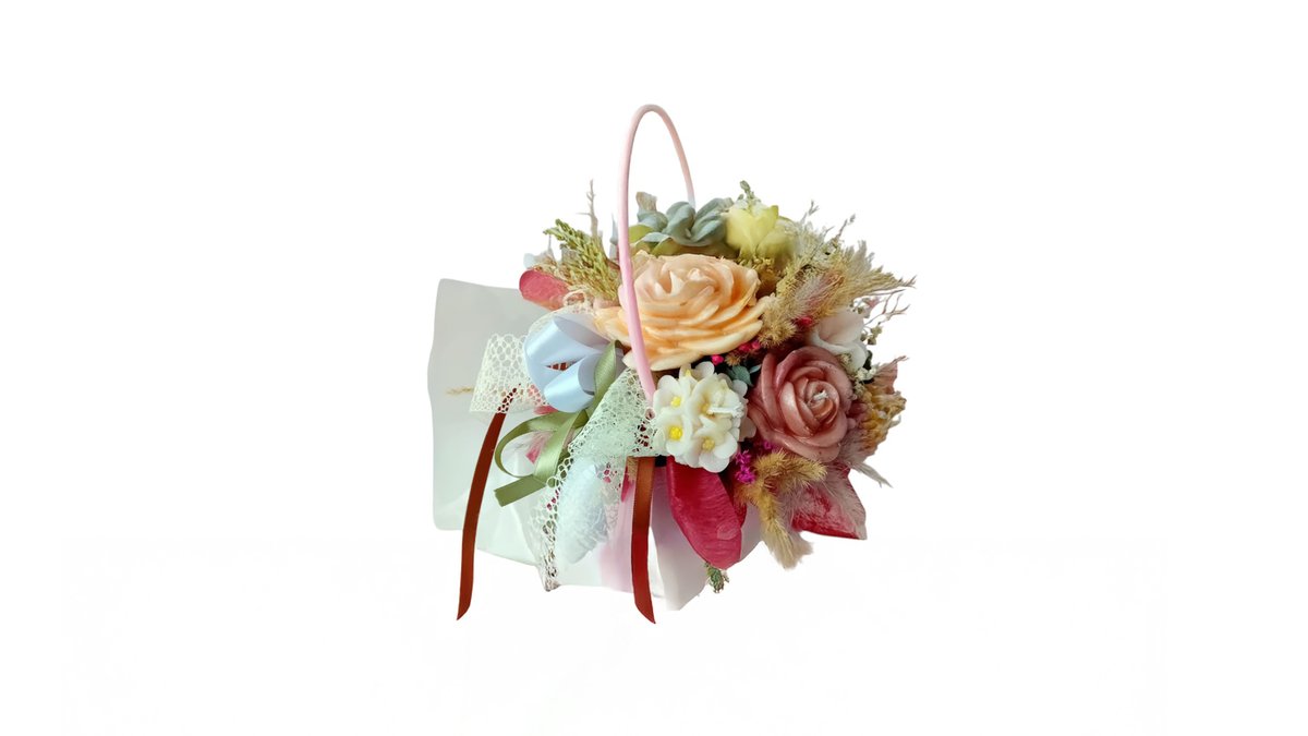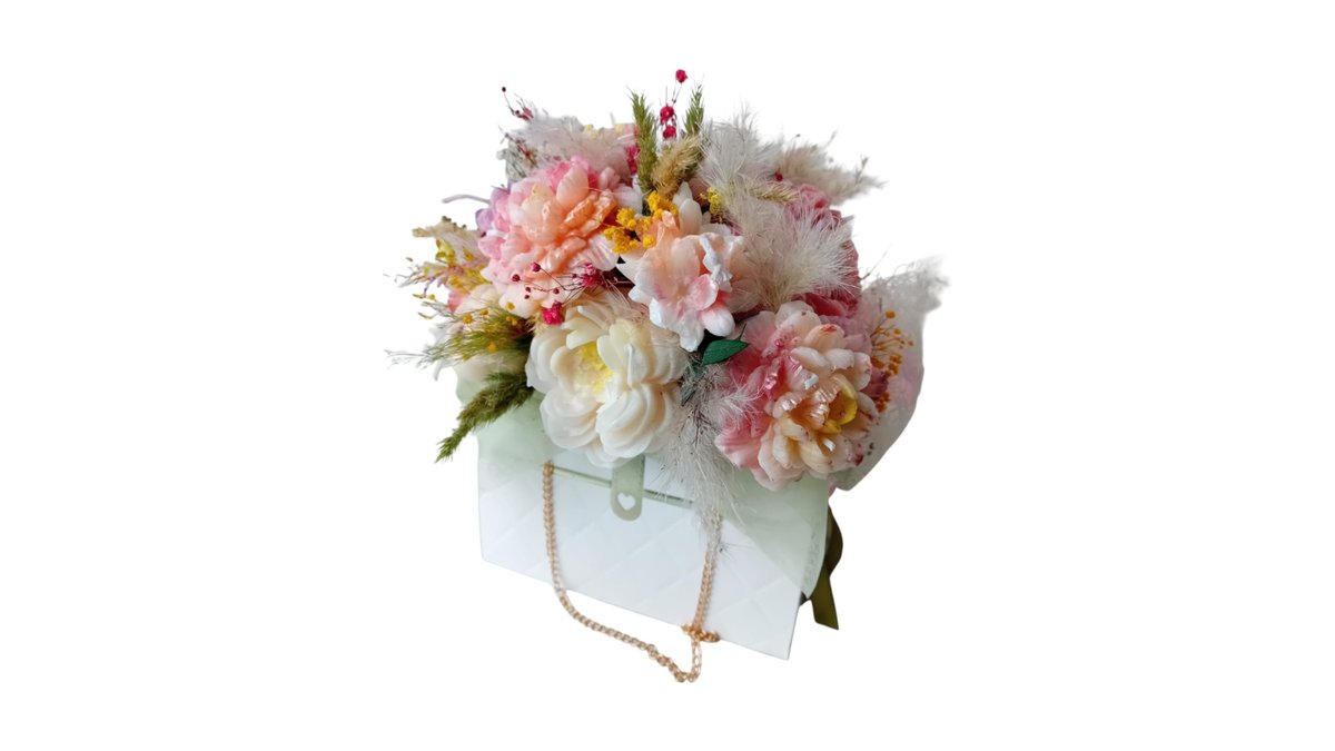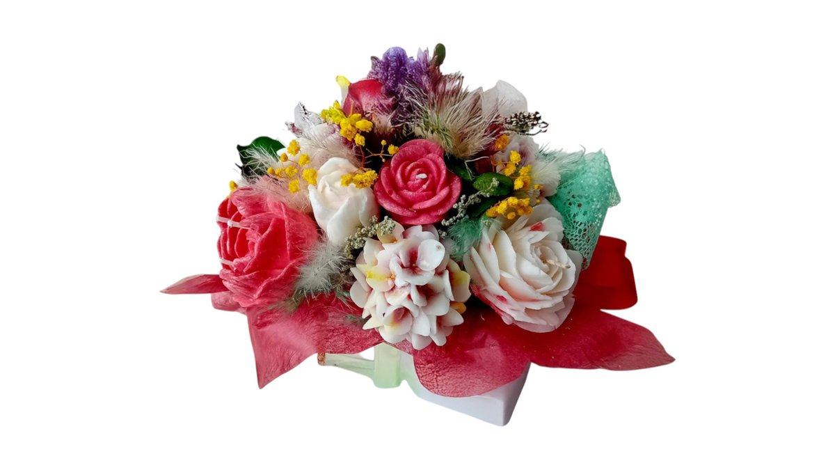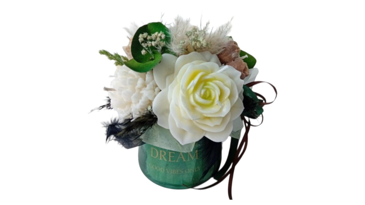 Ručne odlievané sviečkové kvietky s krásnou sviežou vôňou doplnené o sušené a stabilizované kvietky starostlivo naaranžované do elegantného celku.