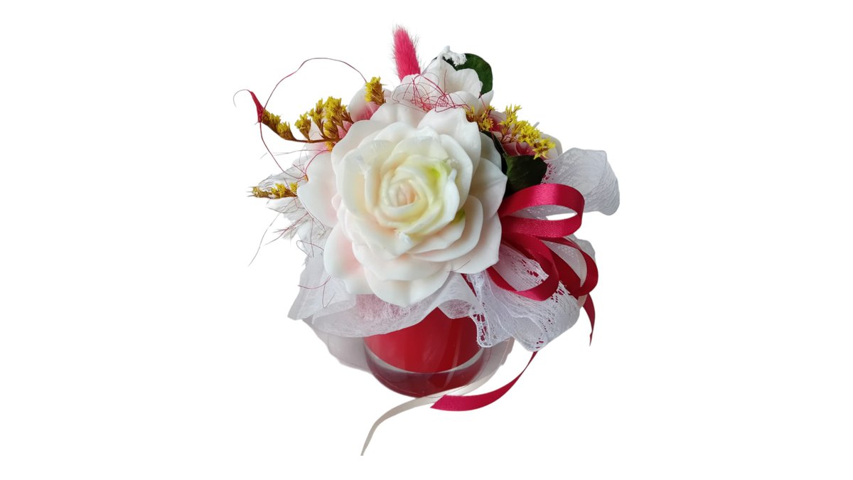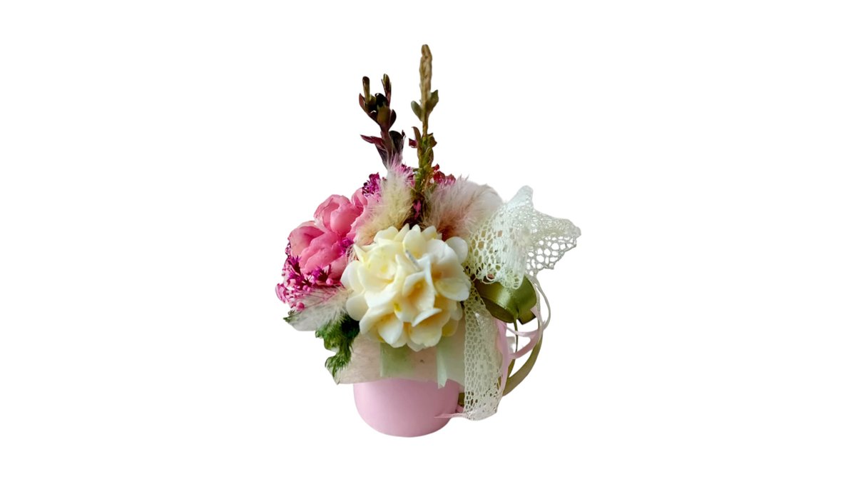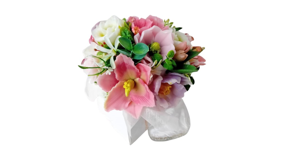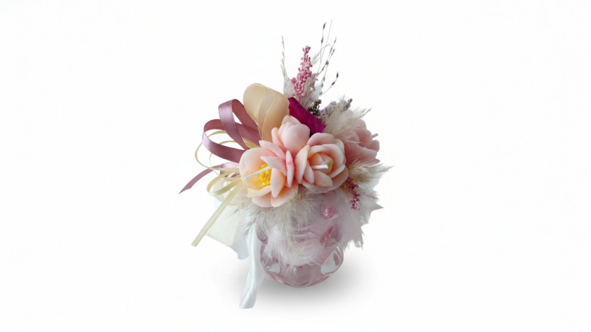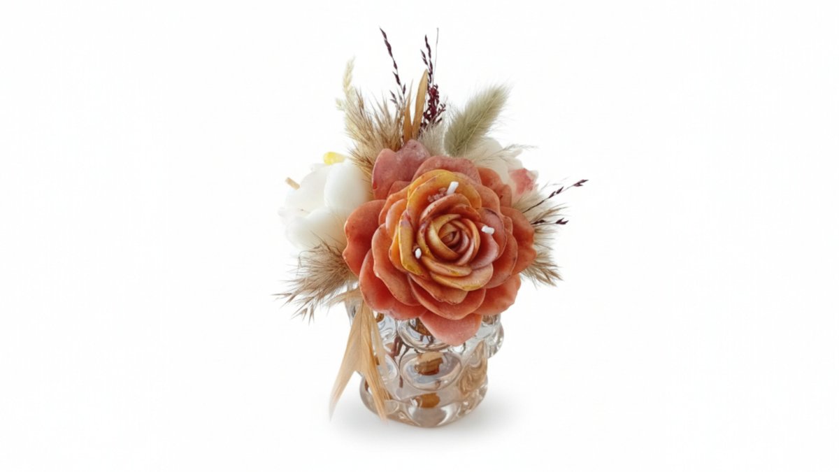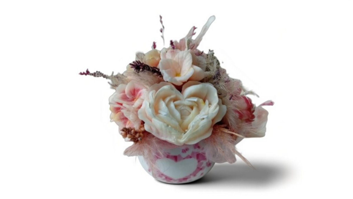 Ručne odlievané sviečkové kvietky s krásnou sviežou vôňou doplnené o sušené a stabilizované kvietky starostlivo naaranžované do elegantného celku.