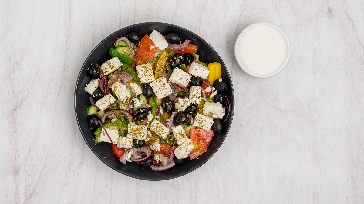 olivy, paradajky, paprika, uhorky, syr feta, červená cibuľa, olivový olej 350g / obsahuje: 7, 13