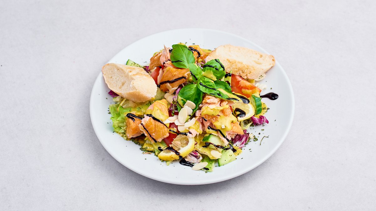 miešaný listový šalát s kúskami grilovaného lososa, čierne olivy, citrón 350g / obsahuje: 4, 7, 10, 13