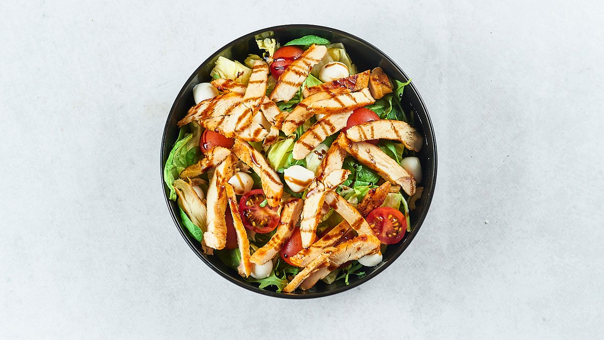 ľadový šalát, paradajky, paprika, uhorky, kuracie prsia, parmezán, krutóny 350g / obsahuje: 1, 7