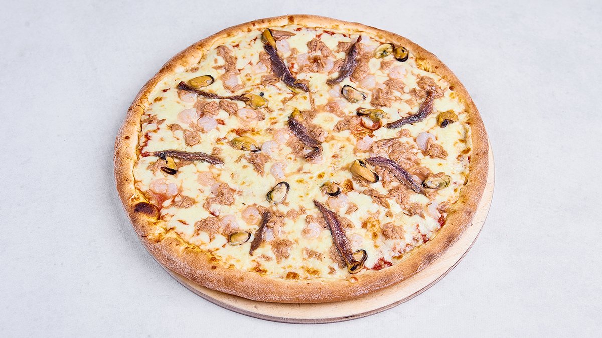 paradajková omáčka, syr, cibuľa, tuniak, zelené olivy 1200g / obsahuje: 1, 4, 7, 13